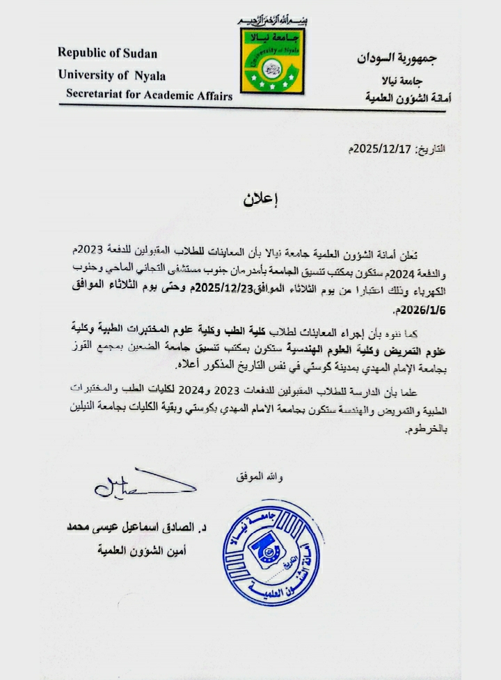 أعلنت أمانة الشؤون العلمية بجامعة نيالا اليوم عن بدء إجراء المعاينات للطلاب المقبولين في الدفعتين الدراسيتين 2023 و 2024، وذلك اعتباراً من يوم الثلاثاء الموافق 23 ديسمبر 2025، وتستمر حتى الثلاثاء الموافق 6 يناير 2026.