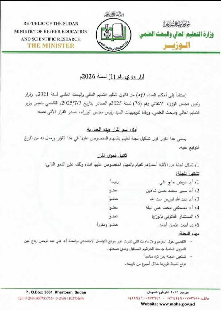 أصدر وزير التعليم العالي والبحث العلمي في السودان القرار الوزاري رقم (1) لسنة 2026، بتشكيل لجنة تقصي حقائق برئاسة أ.د. عوض حاج علي، للتحقيق في المزاعم والادعاءات التي نشرت عبر منصات التواصل الاجتماعي من قبل أمين الشؤون العلمية بجامعة الخرطوم. تضم اللجنة مجموعة من الأكاديميين بالإضافة إلى المستشار القانوني للوزارة، حيث تم توجيهها برفع تقريرها النهائي خلال أسبوع واحد. كما يُسمح للجنة بالاستعانة بمن تراه مناسبًا لإتمام مهامها.