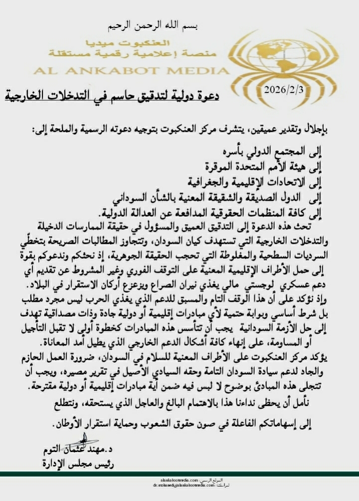 تحث هذه الدعوة إلى التدقيق العميق والمسؤول في حقيقة الممارسات الدخيلة والتدخلات الخارجية التي تستهدف كيان السودان، وتتجاوز المطالبات الصريحة بتخطّي السرديات السطحية والمغلوطة التي تحجب الحقيقة الجوهرية، إذ نحثكم وندعوكم بقوة إلى حمل الأطراف الإقليمية المعنية على التوقف الفوري وغير المشروط عن تقديم أي دعم عسكري أو لوجستي أو مالي يغذي نيران الصراع ويزعزع أركان الاستقرار في البلاد.