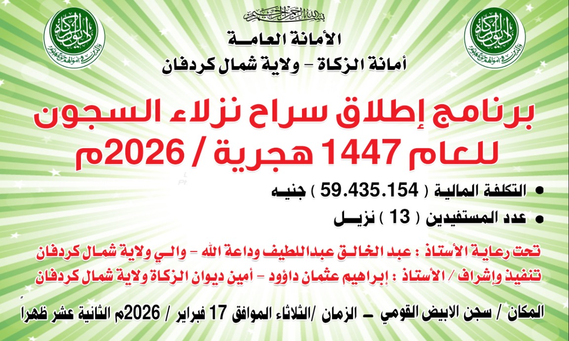 وأشاد والي شمال كردفان بدور ديوان الزكاة في دعم الشرائح الضعيفة وتعزيز الأمن المجتمعي، مشدداً على ضرورة أن تمثل عملية الإفراج بداية جديدة للمفرج عنهم، وداعياً إلى تقديم برامج رعاية وإدماج اجتماعي لهم، ومؤكداً دعم الولاية لإدارة السجن في عدد من الجوانب.