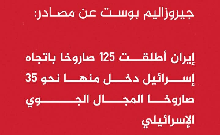 أفادت صحيفة جيروزاليم بوست نقلاً عن مصادر، اليوم، أن إيران أطلقت 125 صاروخاً باتجاه إسرائيل، دخل منها نحو 35 صاروخاً المجال الجوي الإسرائيلي. ولم تصدر حتى الآن بيانات رسمية إسرائيلية أو إيرانية مفصلة تؤكد الأرقام أو تبين مستوى الأضرار أو استجابة الدفاعات الجوية. وتعمل الجهات الأمنية والإعلامية على توثيق تطورات الوضع وتقييم الخسائر المحتملة والردود الأمنية.