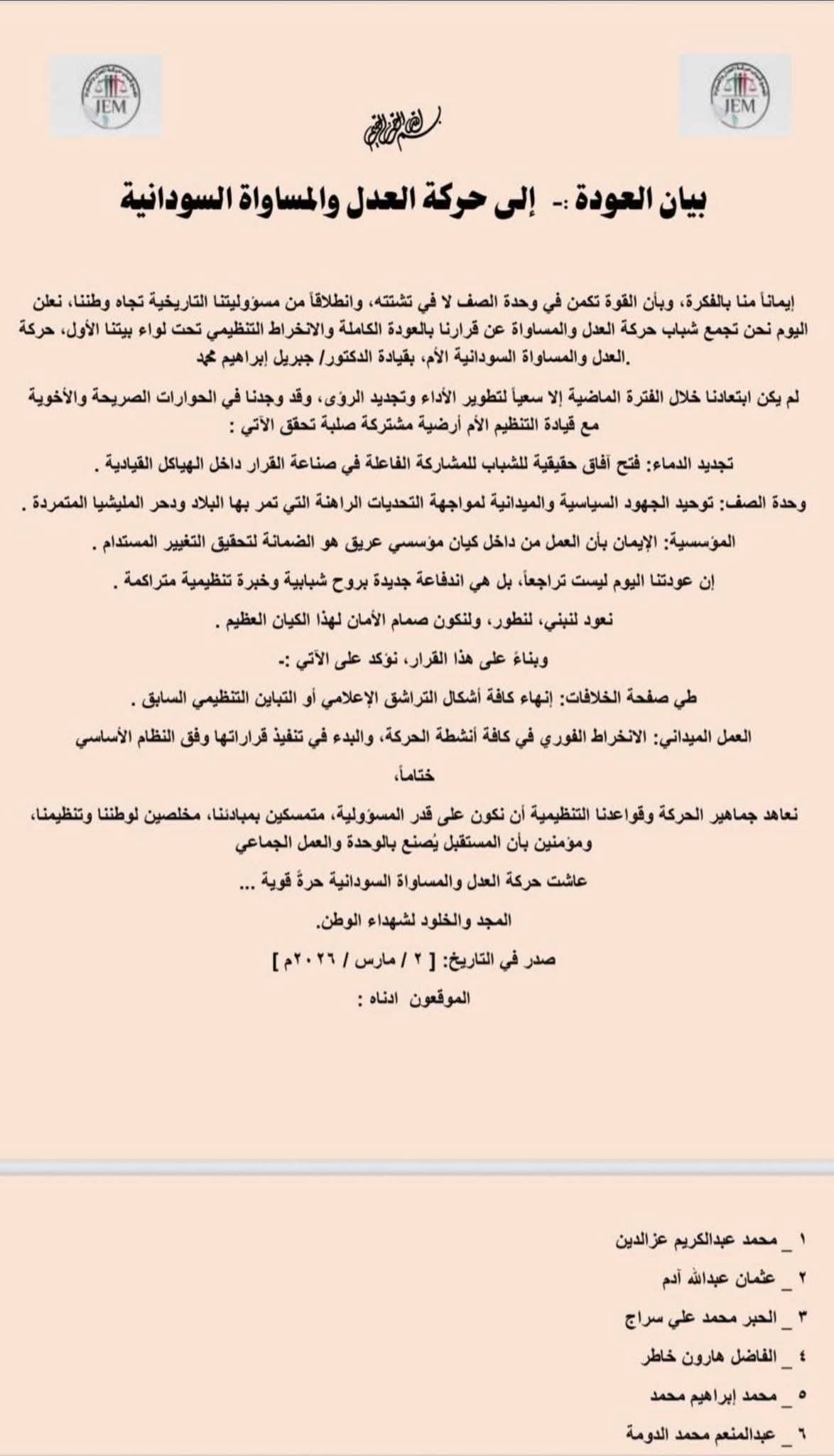تجمع شباب حركة العدل والمساواة يعلنون العودة الكاملة والانخراط التنظيمي تحت لواء حركة العدل والمساواة السودانية بقيادة د.جبريل إبراهيم.
