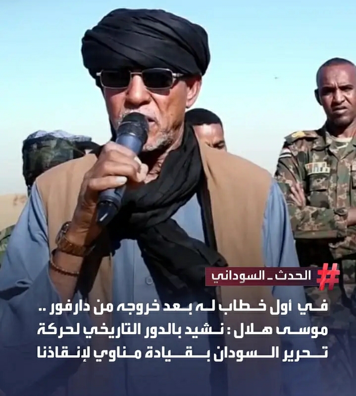 أشاد الزعيم الأهلي موسى هلال بالدور الذي لعبته حركة تحرير السودان بقيادة مني أركو مناوي، واصفاً إياه بـ”التاريخي” في تمكينهم من الانسحاب من منطقة مستريحة إلى داخل البلاد. وفي أول خطاب له عقب خروجه من دارفور، قال هلال إن “الحرب قد بدأت الآن” مؤكداً أن القضية وطنية وأنهم مستعدون لبذل الغالي والنفيس حتى “تتحر البلاد من الدعم السريع”. وأضاف أن الجيش والشعب وجميع القوات المساندة قادرون على تحرير السودان وإعادة استقراره. (المصدر: الحدث السوداني)