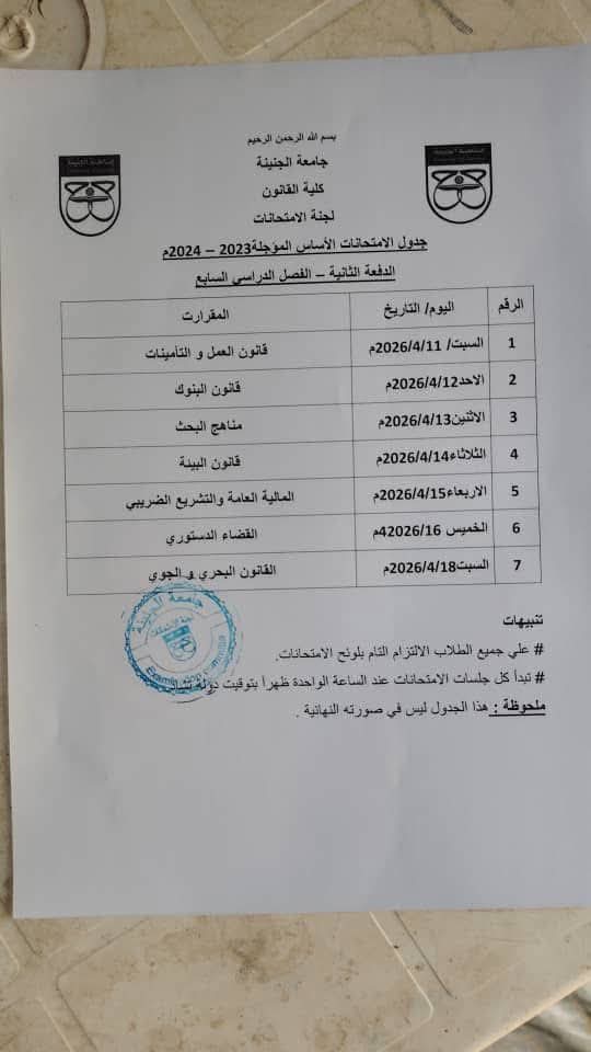 • جامعة الجنينة تعلن امتحانات كلية القانون للفصل الدراسي السابع بدولة تشاد