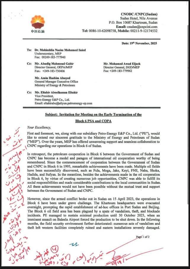 الخطاب الصادر من CNODC/CNPC بشأن الدعوة لإنهاء اتفاقيات الـ PSA والـ COPA في Block 6 قبل نهاية 2025 ليس خطاباً روتينياً، بل وثيقة تشير بوضوح إلى انهيار شامل في البيئة التشغيلية لقطاع النفط السوداني. لغة الخطاب تحمل دلالات تقنية دقيقة: “Force Majeure”، “Unattainable Environment”، “Financial Unsustainability” — وهي عبارات لا تُستخدم إلا عندما تكون البنية المؤسسية للدولة قد خرجت فعلياً عن نطاق القدرة التشغيلية.