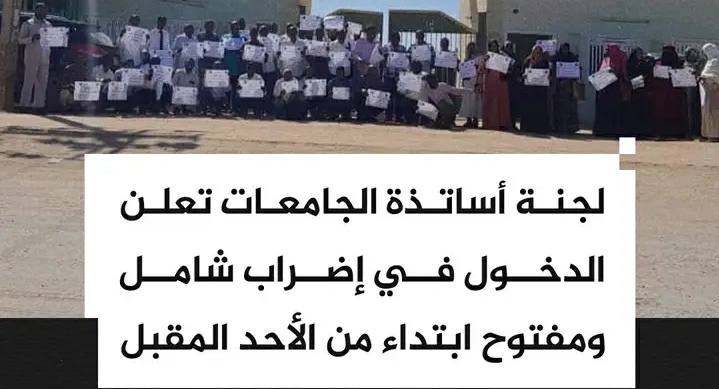 أعلنت لجنة أساتذة الجامعات السودانية (لاجسو) اليوم دخولها في إضراب شامل ومفتوح، يبدأ الأحد المقبل 30 مارس، ويشمل جميع أساتذة الجامعات دون أي استثناء حتى تتم الموافقة على الهيكل الراتبي ولائحة شروط الخدمة الخاصة بالهيئة التدريسية.