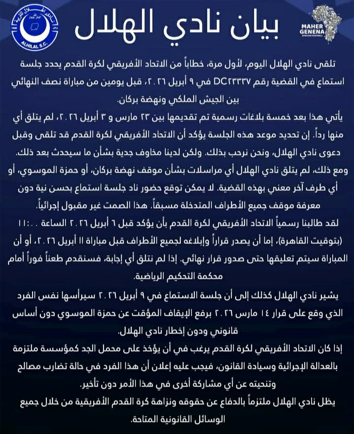 📝 بيان رسمي من نادي الهلال السوداني 🇸🇩 يوضح آخر المستجدات في شكواه ورد الكاف عليها و تحفظه من تأخير سير الإجراءات و من المسؤول عن رئاسة جلسة الاستماع الذي وقع على قرار رفع الإيقاف المؤقت على لاعب نهضة بركان دون أساس قانوني بحسب ما جاء في البيان 👇