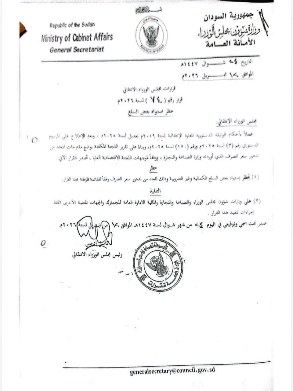 • قرار بحظر استيراد بعض السلع في السودان