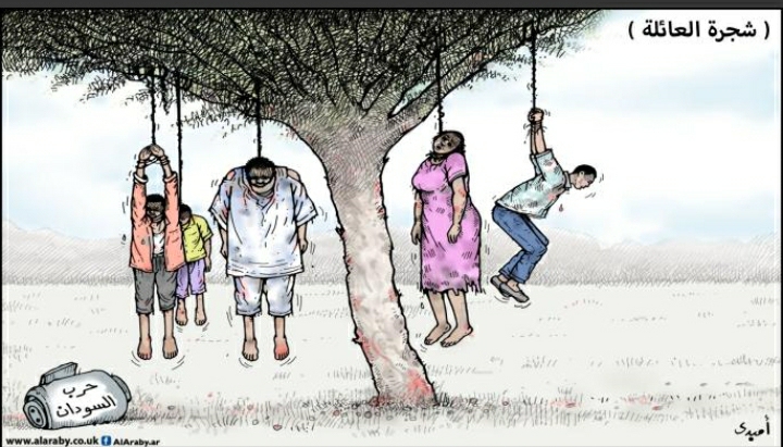 ينقل الكاريكاتير الذي يظهر فيه أفراد معلقون على شجرة تحت عنوان “شجرة العائلة” صورة صادمة لمدى المعاناة. هؤلاء الأشخاص، بأعمار وأجناس مختلفة، معلقون بلا حول ولا قوة، ليجسدوا قضايا ملحة يعيشها السودان.