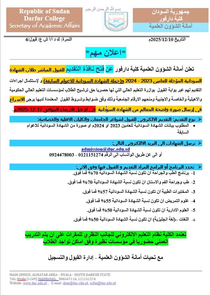 تعلن أمانه الشؤون العلمية كلية دارفور